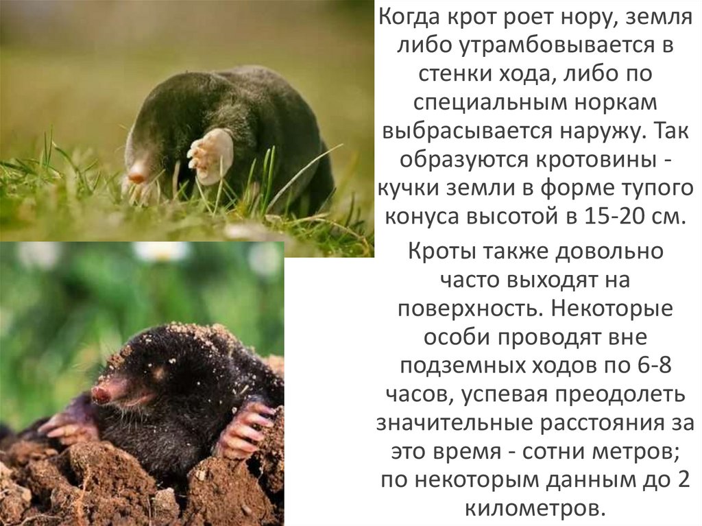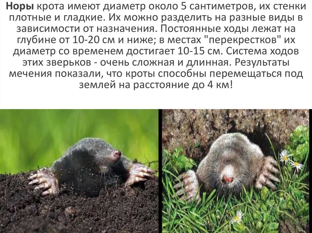 Норы крота имеют диаметр около 5 сантиметров, их стенкиплотные и гладкие. Их можно разделить на разные виды в