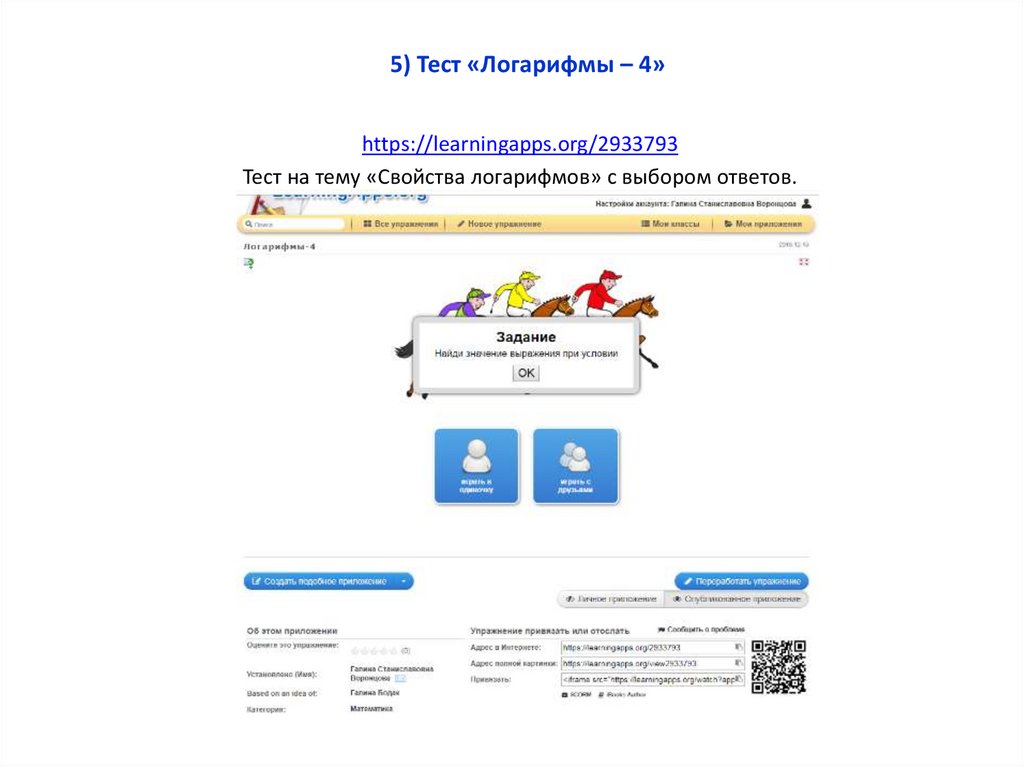 6) Тест «Логарифмы – 5»https://learningapps.org/2932439