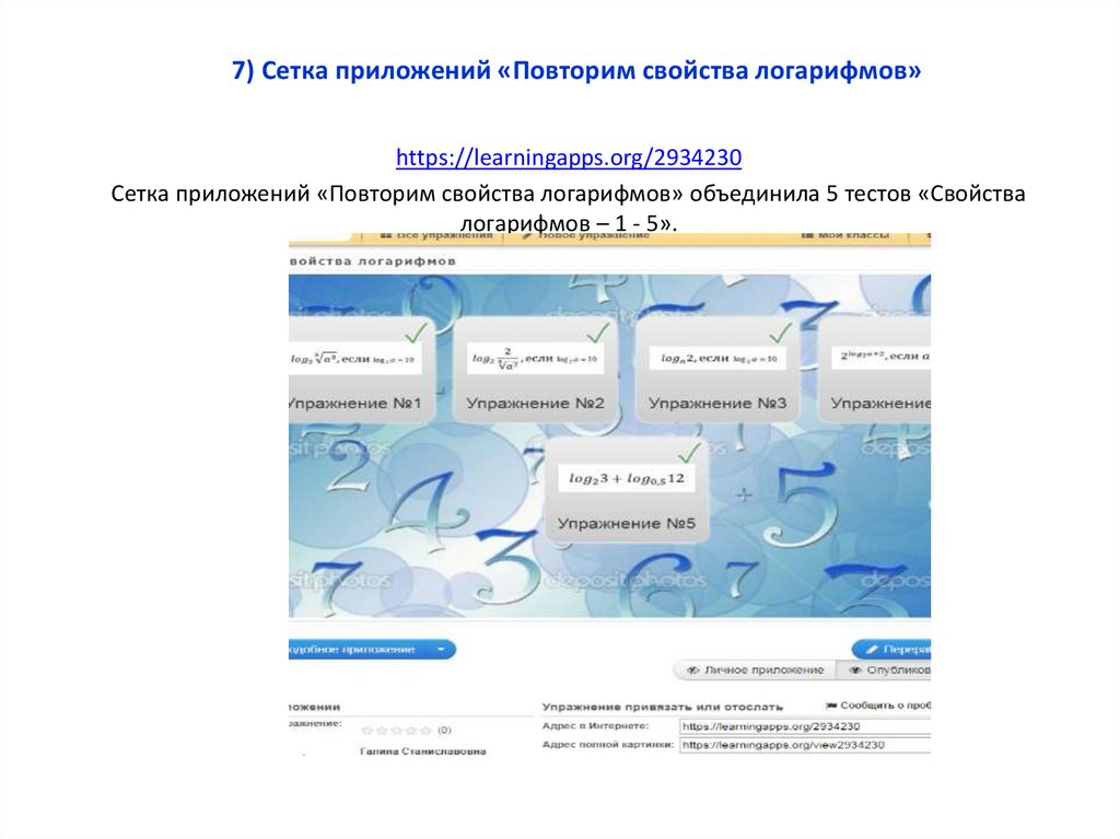 7) Сетка приложений «Повторим свойства логарифмов»https://learningapps.org/2934230