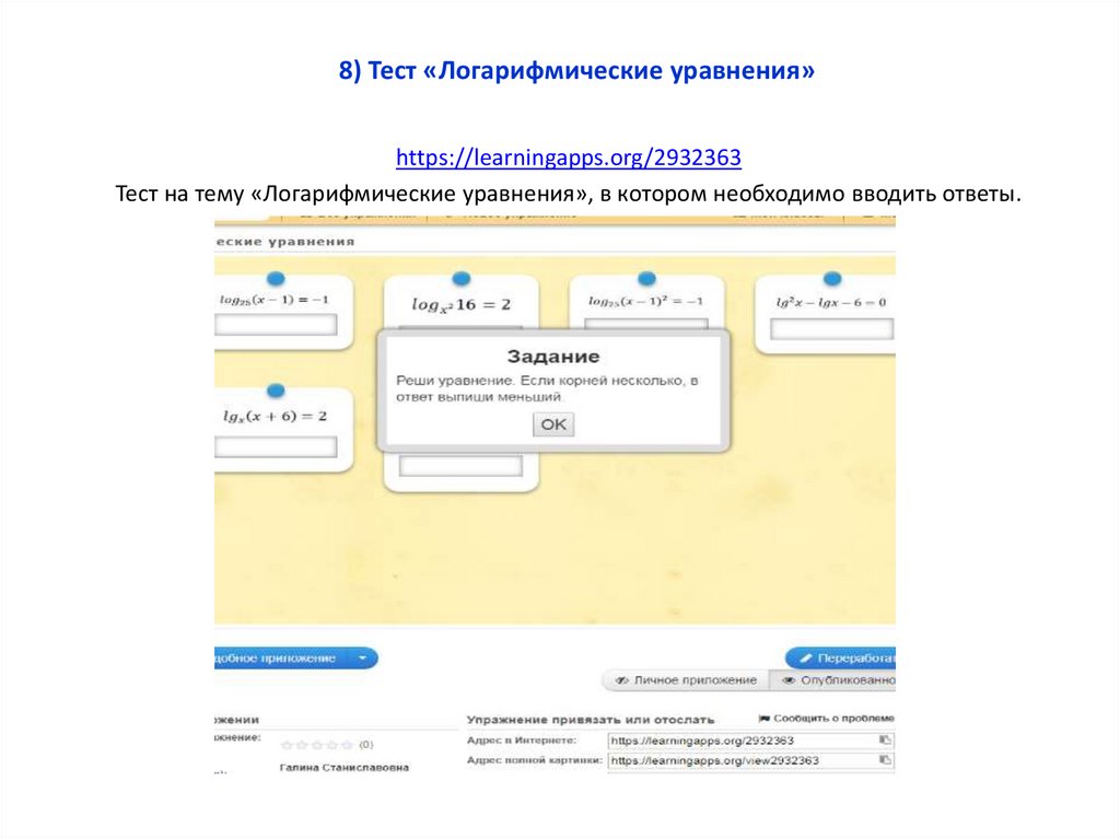 8) Тест «Логарифмические уравнения»https://learningapps.org/2932363