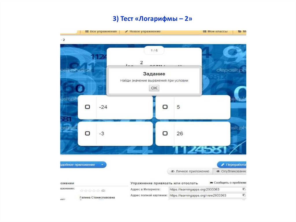 3) Тест «Логарифмы – 2»https://learningapps.org/2933363