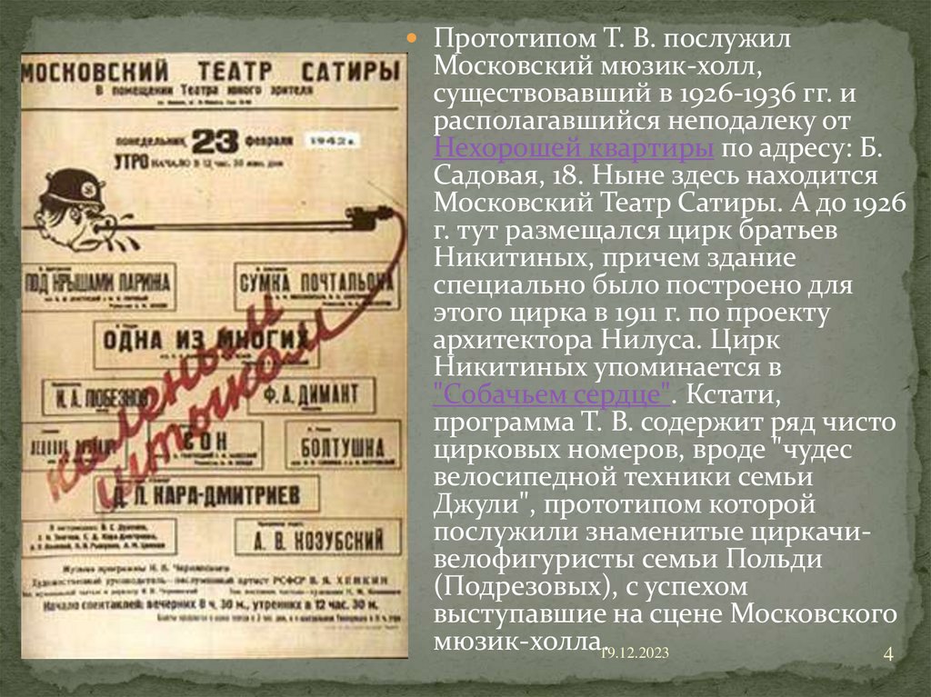 Прототипом Т. В. послужилМосковский мюзик-холл,