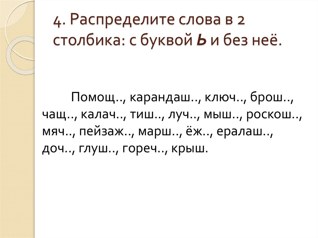 4. Распределите слова в 2столбика: с буквой Ь и без неё.