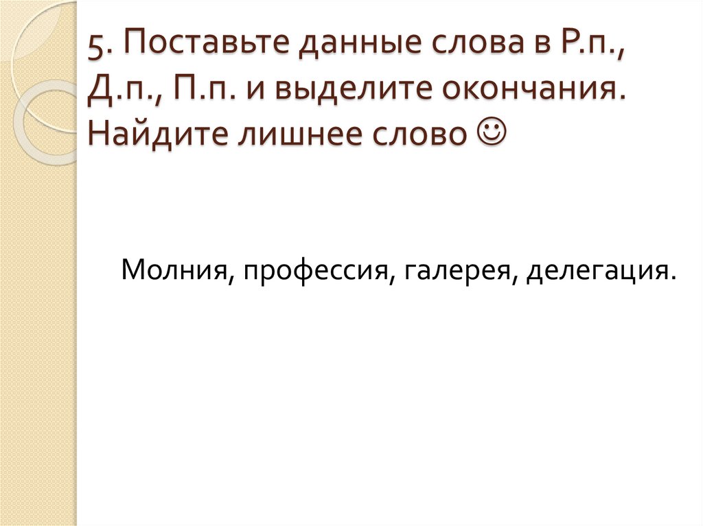 5. Поставьте данные слова в Р.п.,Д.п., П.п. и выделите окончания.