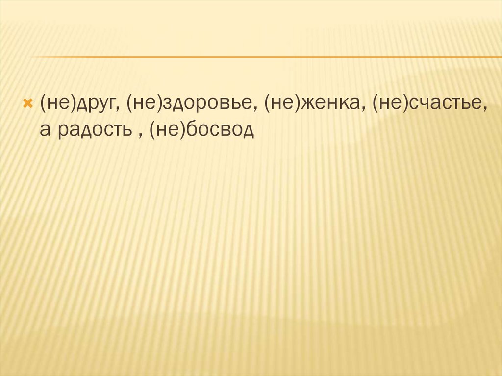 (не)друг, (не)здоровье, (не)женка, (не)счастье,а радость , (не)босвод