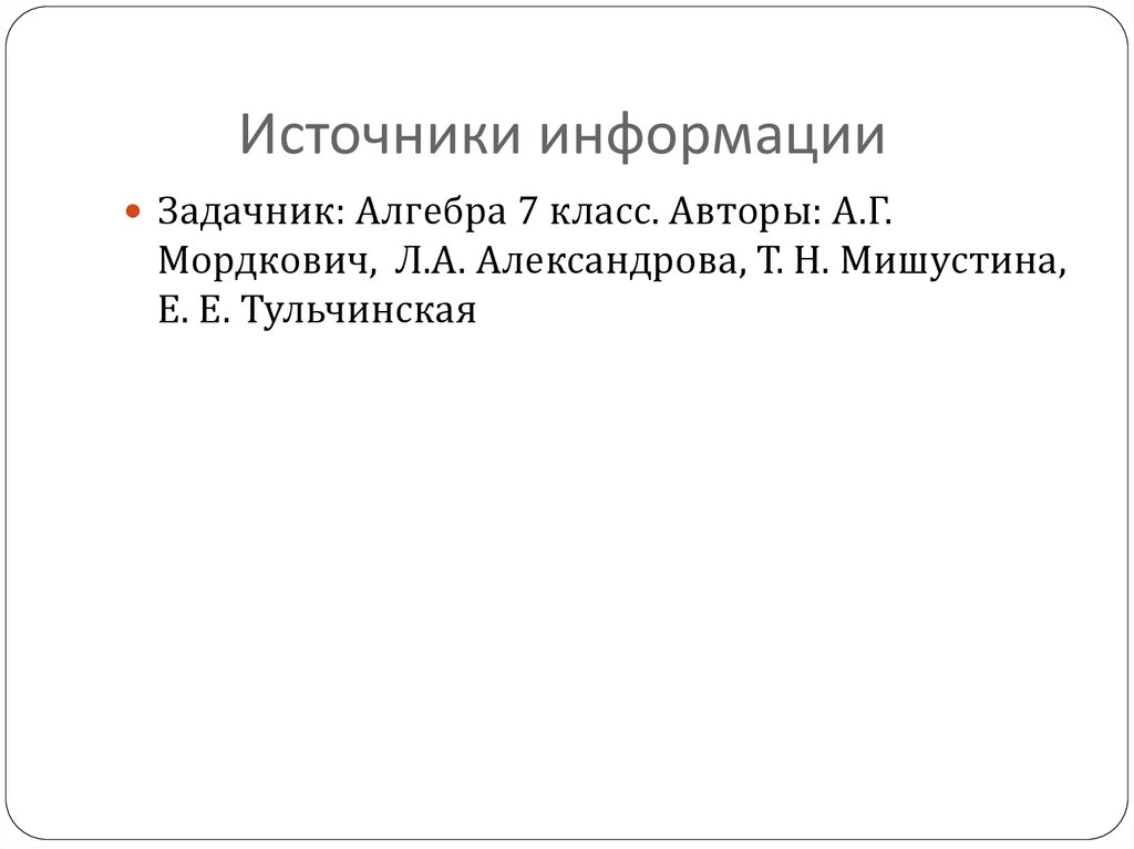 Источники информацииЗадачник: Алгебра 7 класс. Авторы: А.Г.