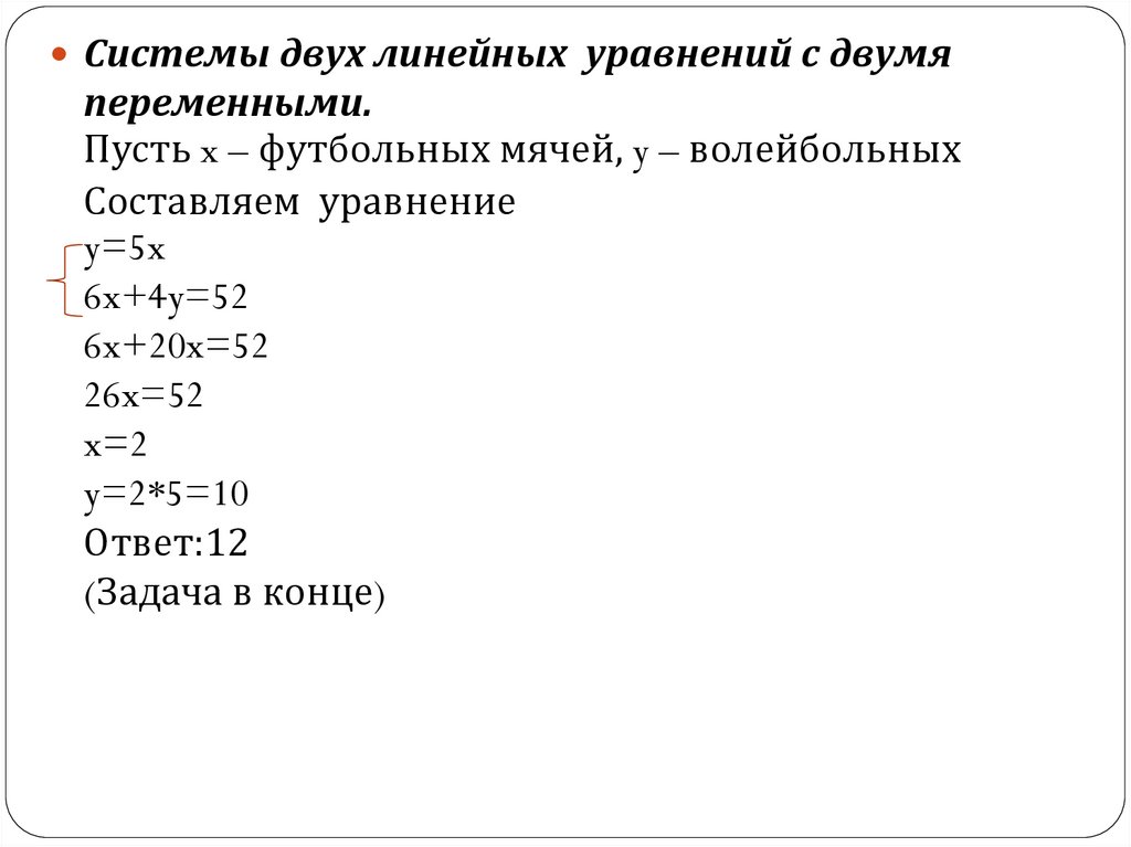 Пусть x – футбольных мячей, y – волейбольных