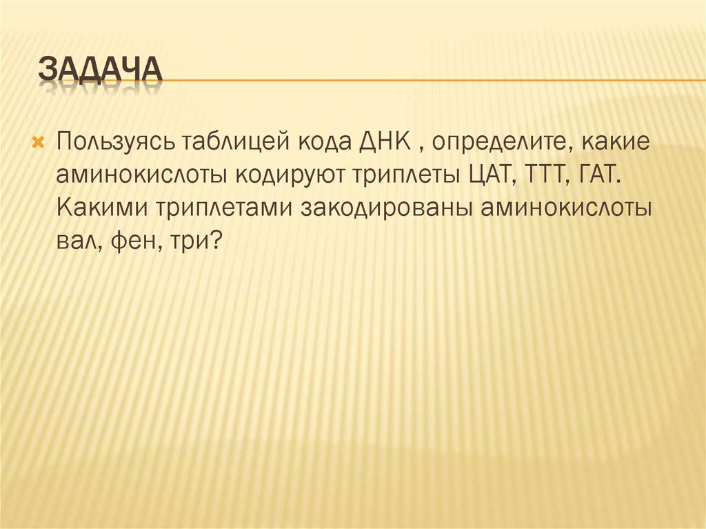 ЗАДАЧАПользуясь таблицей кода ДНК , определите, какие
