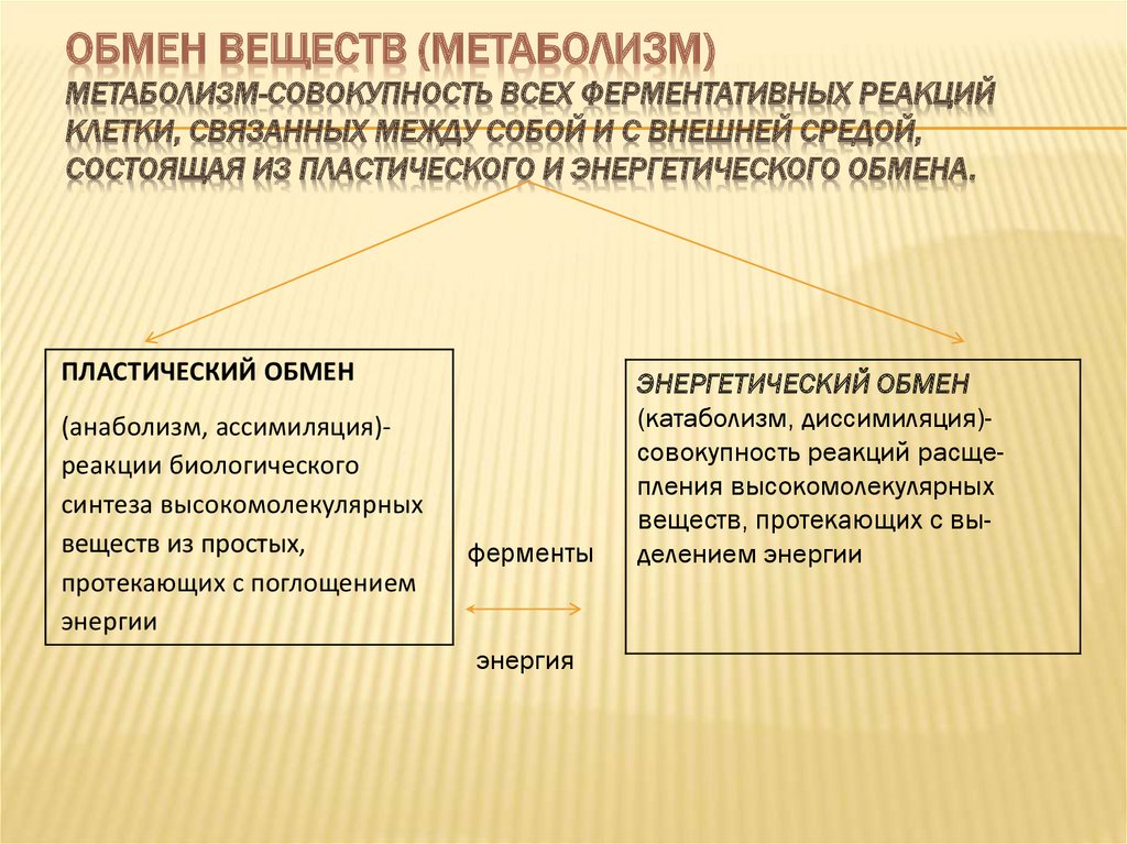 ОБМЕН ВЕЩЕСТВ (МЕТАБОЛИЗМ)МЕТАБОЛИЗМ-СОВОКУПНОСТЬ ВСЕХ ФЕРМЕНТАТИВНЫХ РЕАКЦИЙ