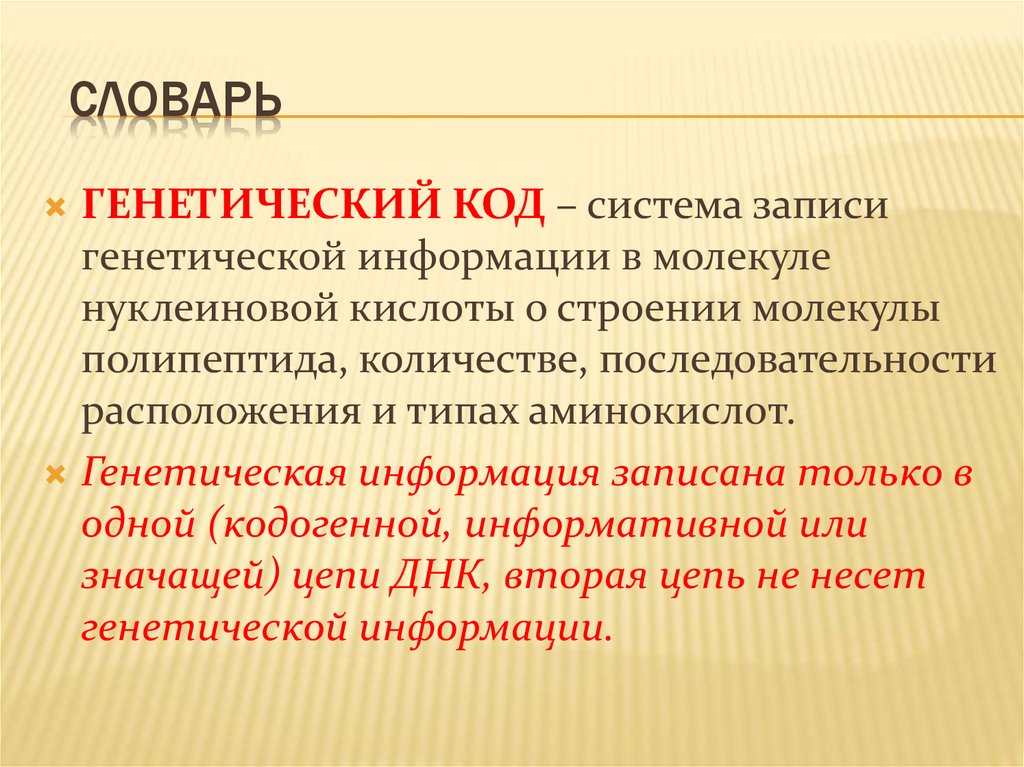 СЛОВАРЬГЕНЕТИЧЕСКИЙ КОД – система записи