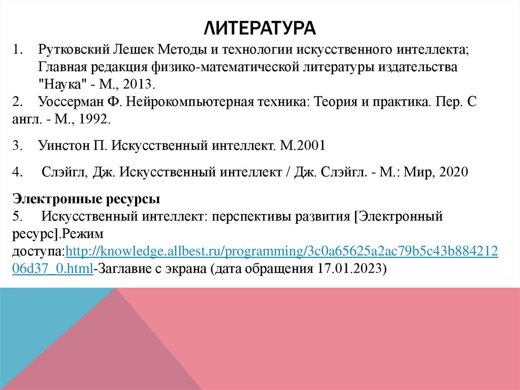 ЛИТЕРАТУРАРутковский Лешек Методы и технологии искусственного интеллекта;