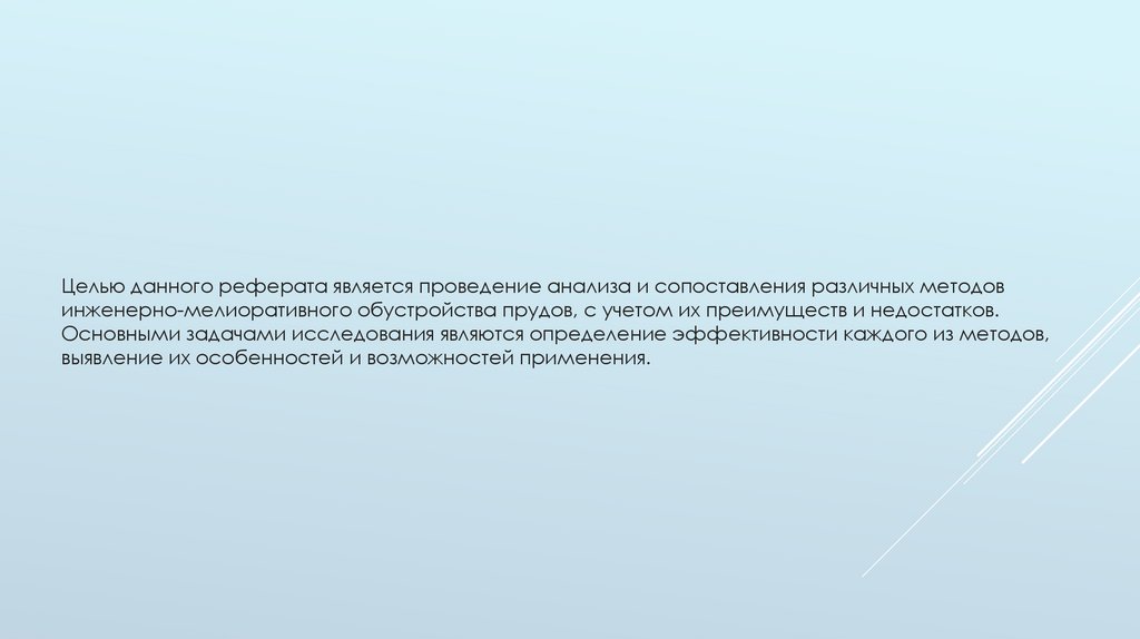 Целью данного реферата является проведение анализа и сопоставления различных методовинженерно-мелиоративного обустройства прудов, с учетом их преимуществ и недостатков.