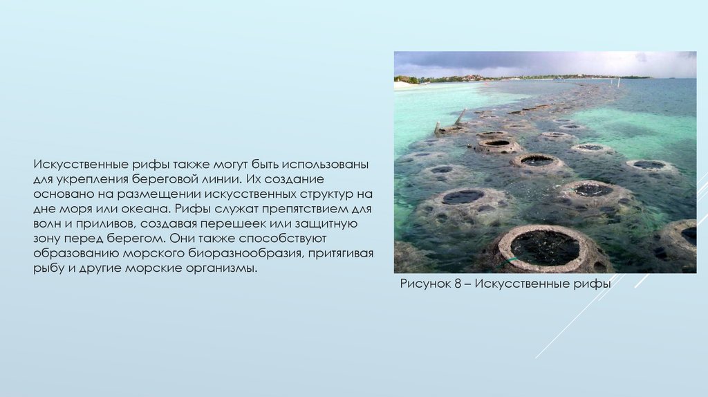 Искусственные рифы также могут быть использованыдля укрепления береговой линии. Их создание