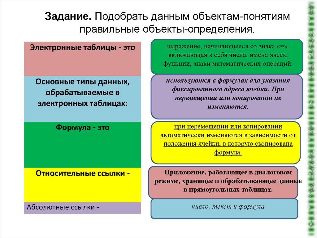 Задание. Подобрать данным объектам-понятиямправильные объекты-определения.