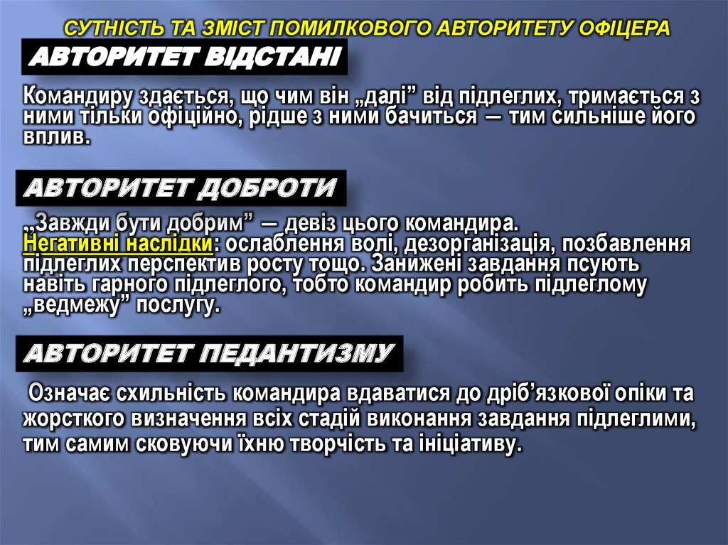 СУТНІСТЬ ТА ЗМІСТ ПОМИЛКОВОГО АВТОРИТЕТУ ОФІЦЕРАКомандиру здається, що чим він „далі” від підлеглих, тримається з