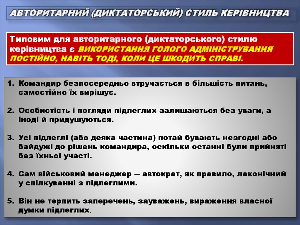 АВТОРИТАРНИЙ (ДИКТАТОРСЬКИЙ) СТИЛЬ КЕРІВНИЦТВАТиповим для авторитарного (диктаторського) стилю