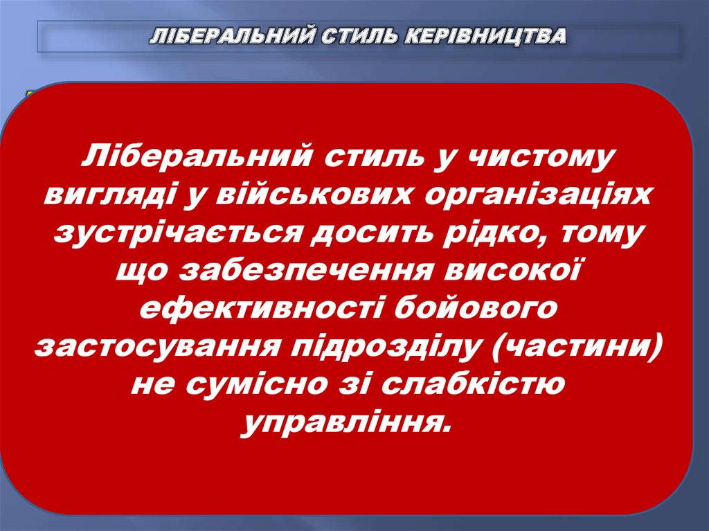ЛІБЕРАЛЬНИЙ СТИЛЬ КЕРІВНИЦТВАТиповим є низький ступінь виявлення влади