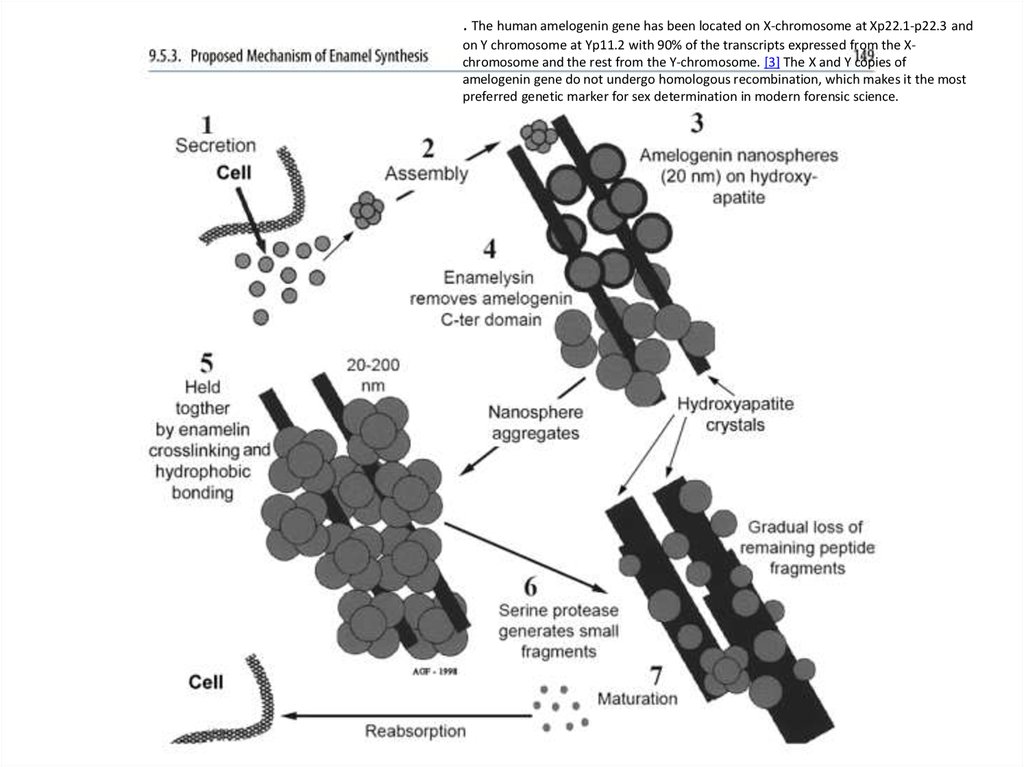 . The human amelogenin gene has been located on X-chromosome at Xp22.1-p22.3 andon Y chromosome at Yp11.2 with 90% of the transcripts expressed from the Xchromosome and the rest from the Y-chromosome. [3] The X and Y copies of