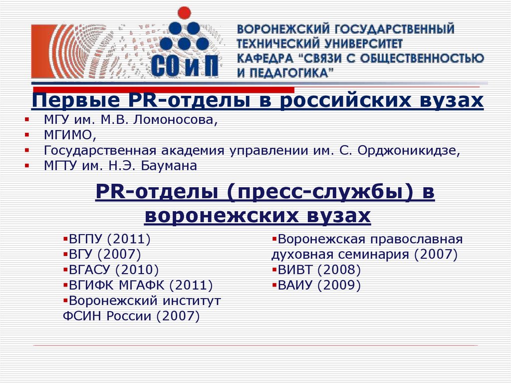 Первые PR-отделы в российских вузахМГУ им. М.В. Ломоносова,