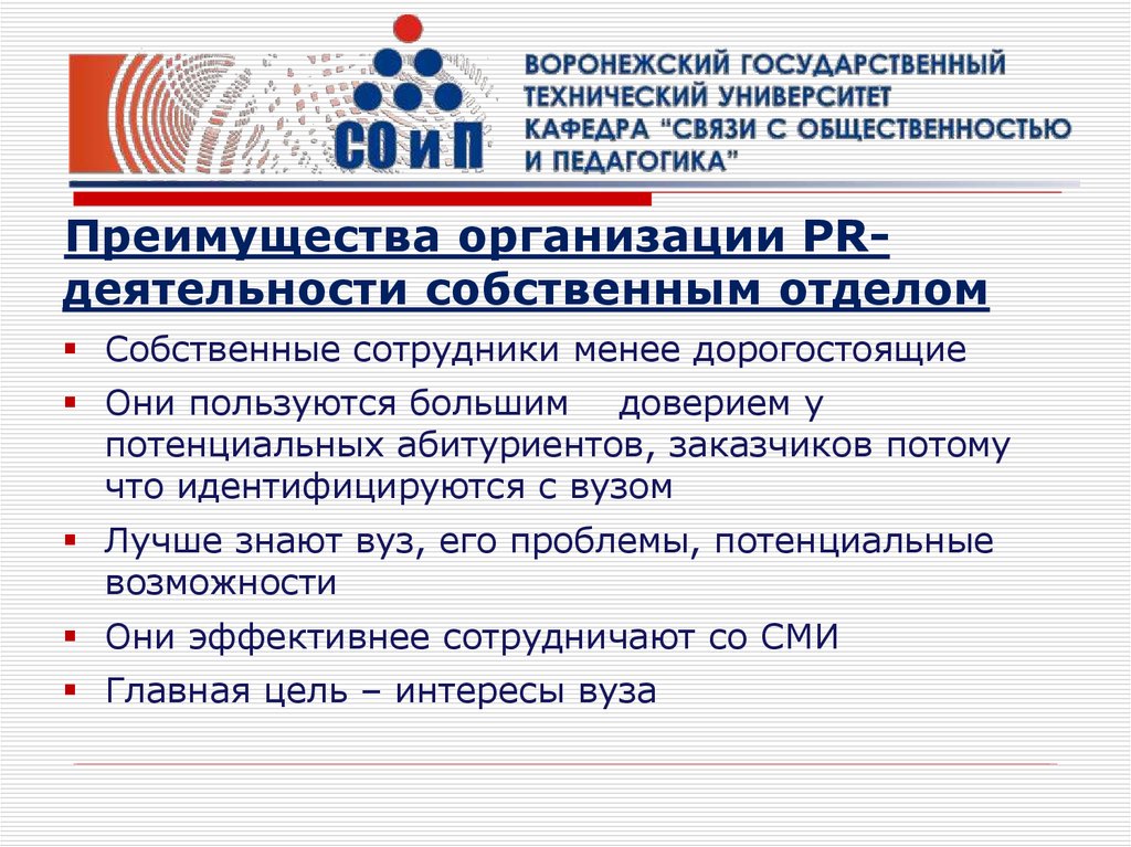 Преимущества организации PRдеятельности собственным отделомСобственные сотрудники менее дорогостоящие