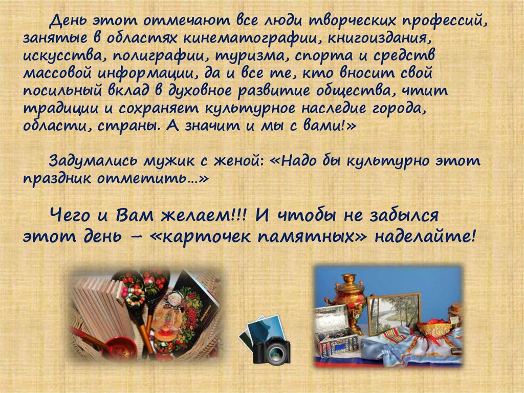День этот отмечают все люди творческих профессий,занятые в областях кинематографии, книгоиздания,