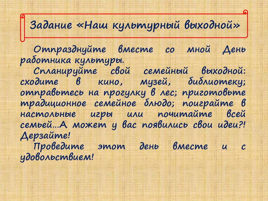 Задание «Наш культурный выходной»Отпразднуйте вместе со мной День