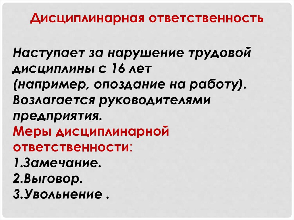 Дисциплинарная ответственностьНаступает за нарушение трудовой