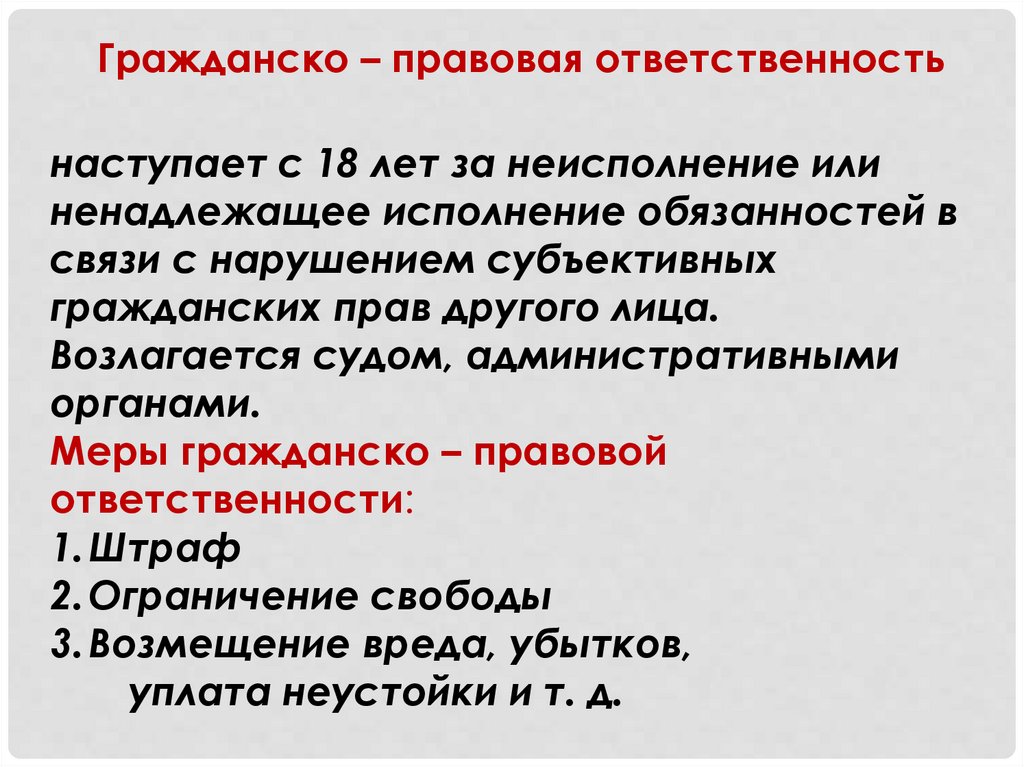Гражданско – правовая ответственностьнаступает с 18 лет за неисполнение или