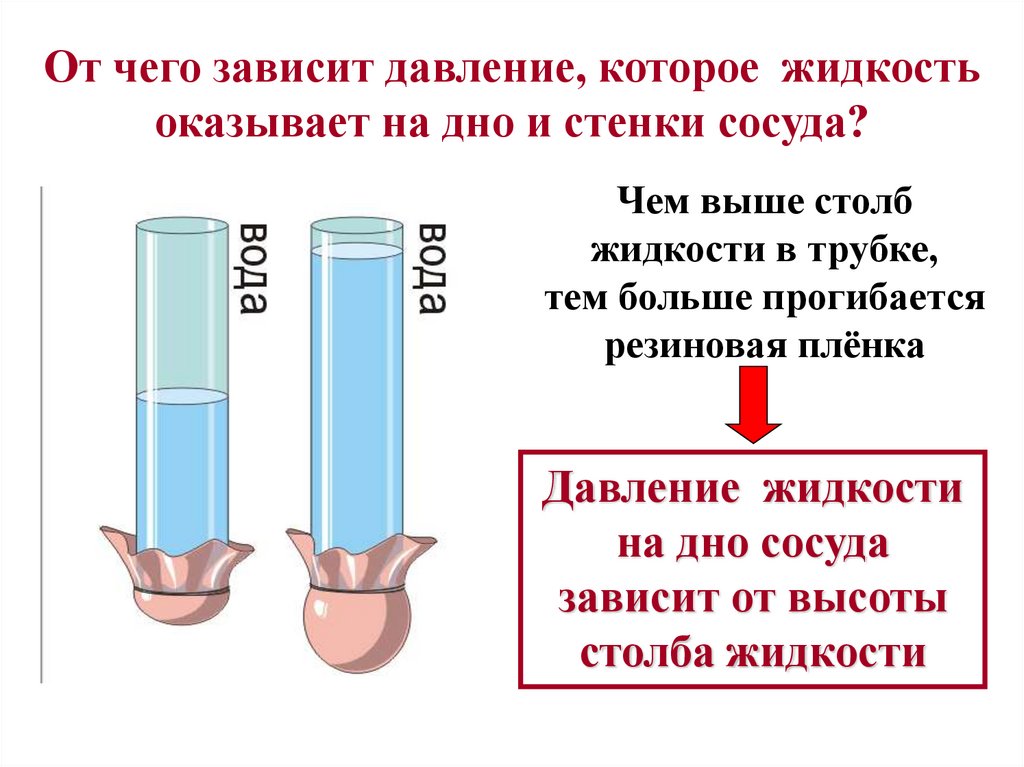 От чего зависит давление, которое жидкостьоказывает на дно и стенки сосуда?