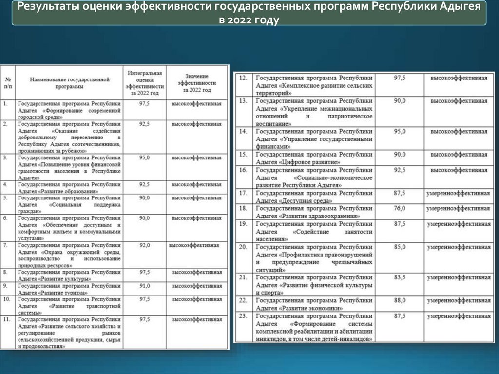 Результаты оценки эффективности государственных программ Республики Адыгеяв 2022 году