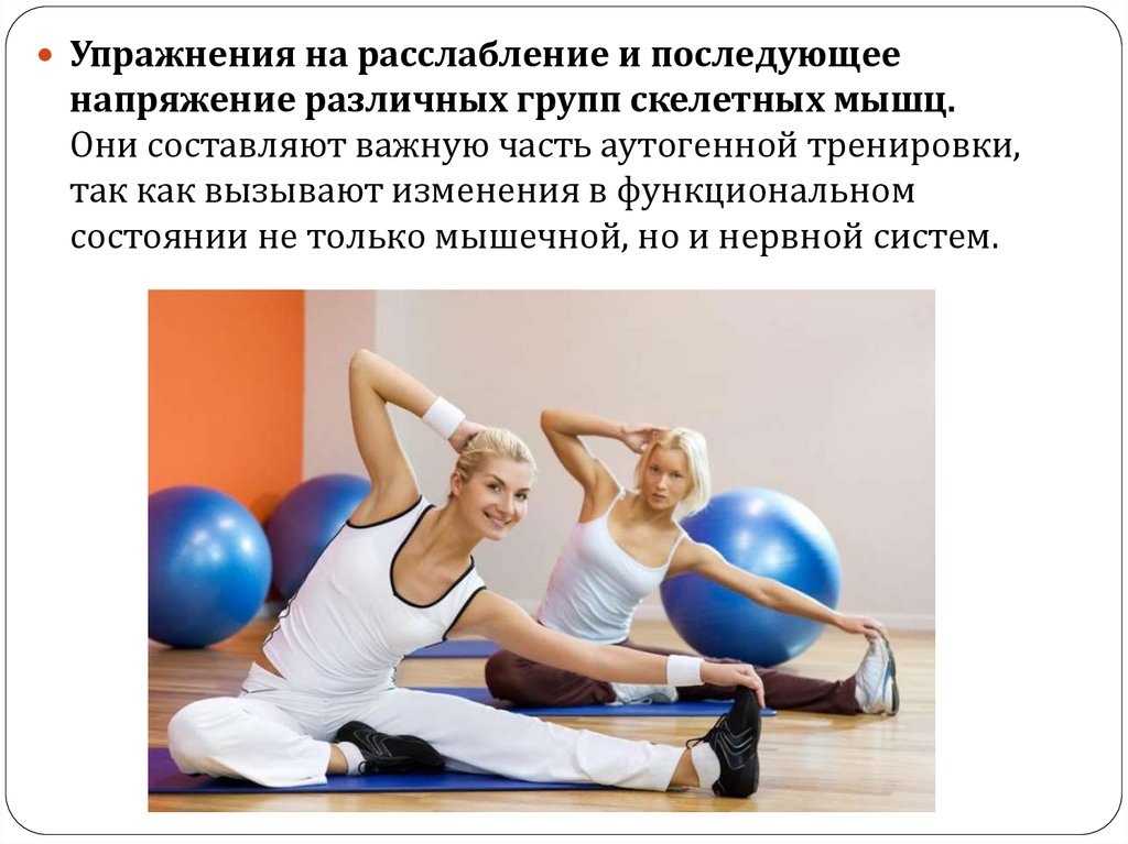 Упражнения на расслабление и последующеенапряжение различных групп скелетных мышц.