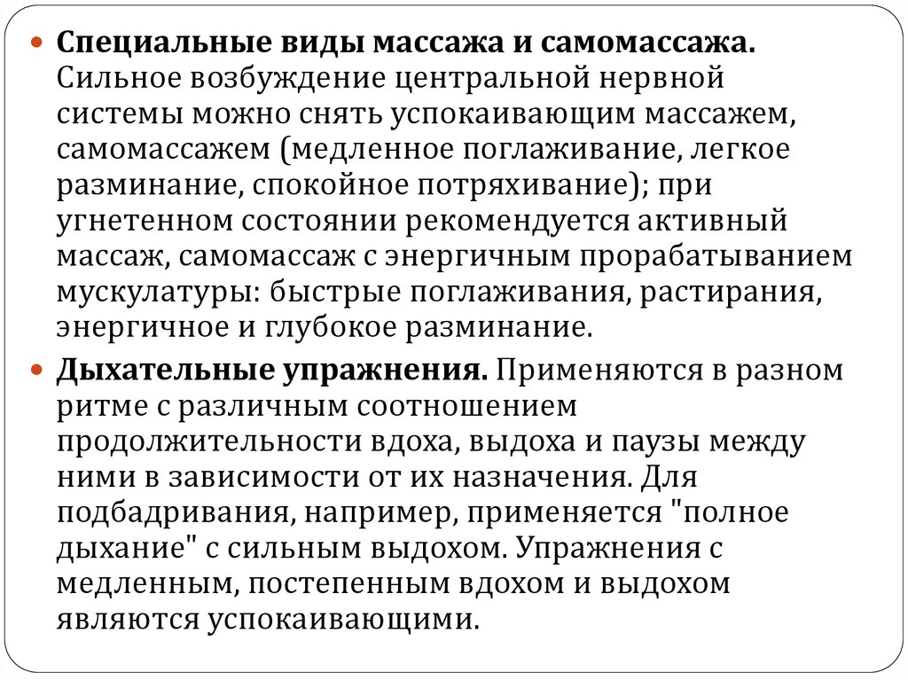 Специальные виды массажа и самомассажа.Сильное возбуждение центральной нервной