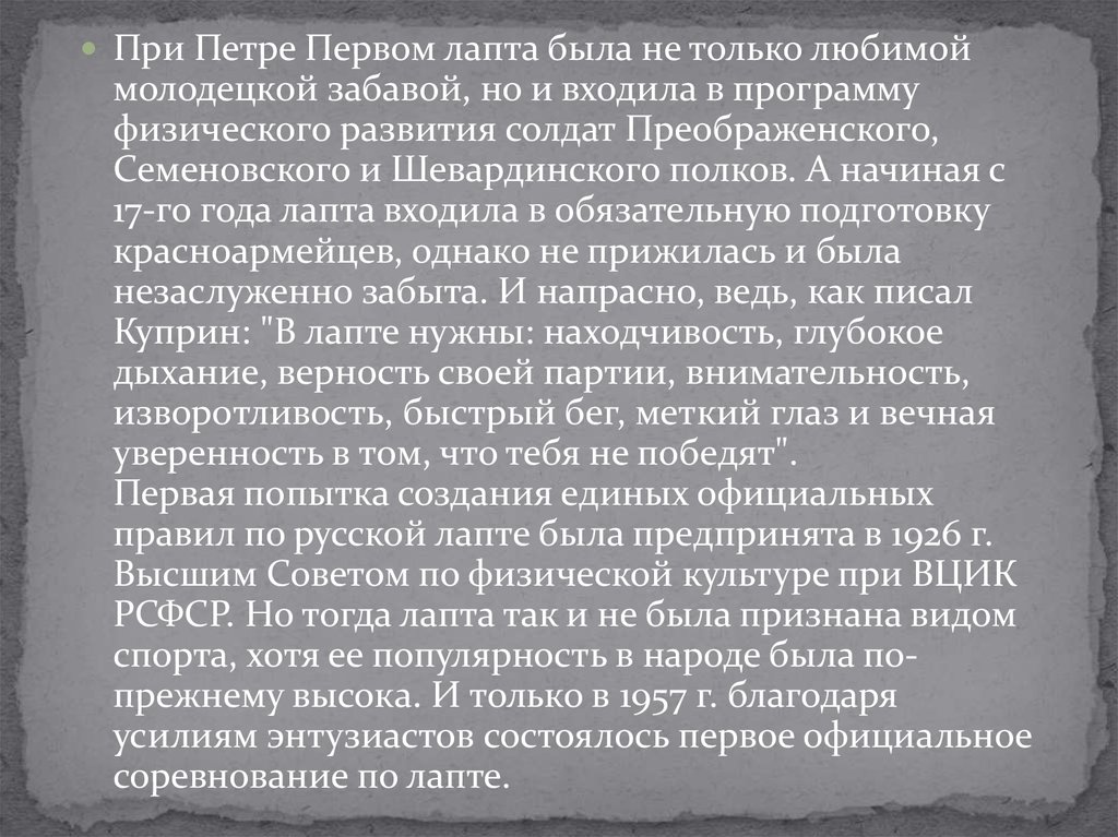 При Петре Первом лапта была не только любимоймолодецкой забавой, но и входила в программу