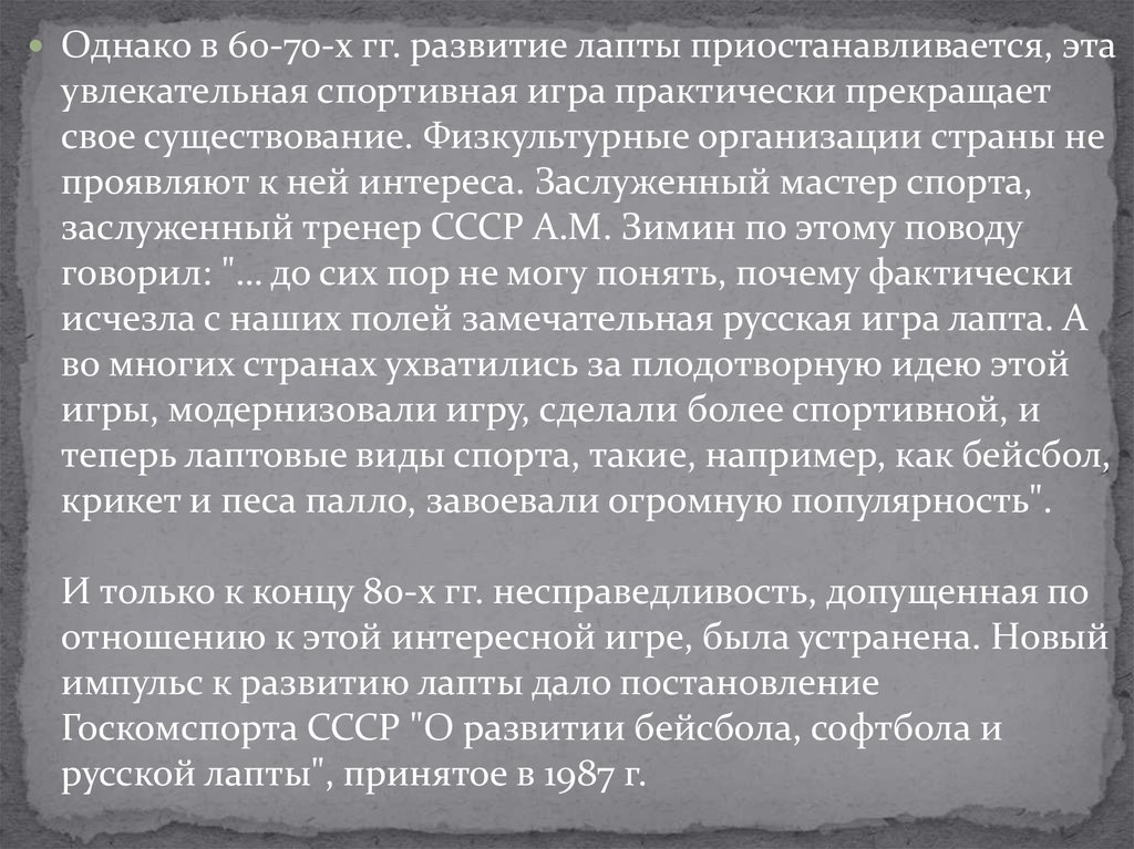 Однако в 60-70-х гг. развитие лапты приостанавливается, этаувлекательная спортивная игра практически прекращает