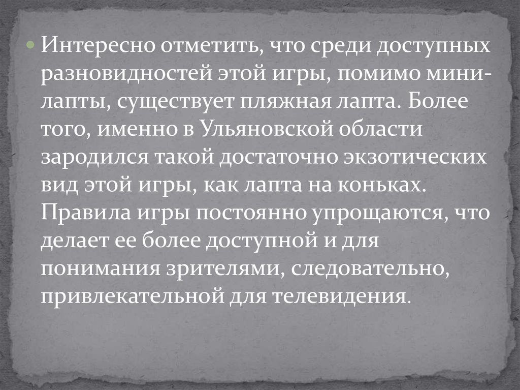 Интересно отметить, что среди доступныхразновидностей этой игры, помимо минилапты, существует пляжная лапта. Более