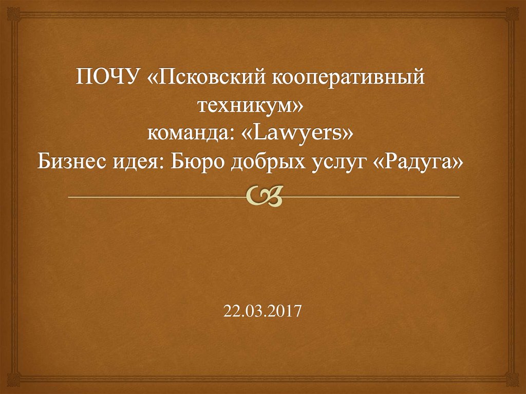 1. ПОЧУ «Псковский кооперативный техникум» команда: «Lawyers» Бизнес идея: Бюро добрых услуг «Радуга»