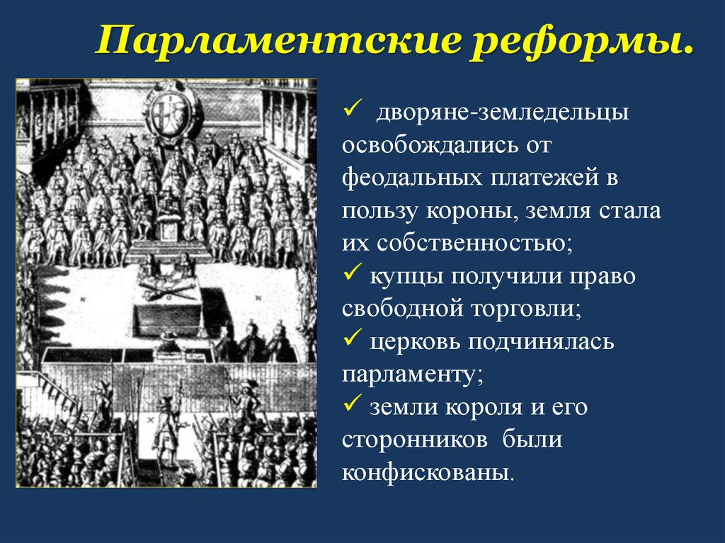 Парламентские реформы.упразднены королевские суды, преследовавшие