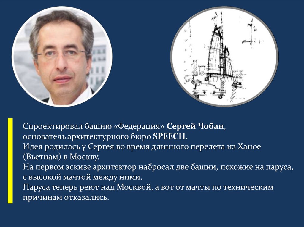 Спроектировал башню «Федерация» Сергей Чобан,основатель архитектурного бюро SPEECH.