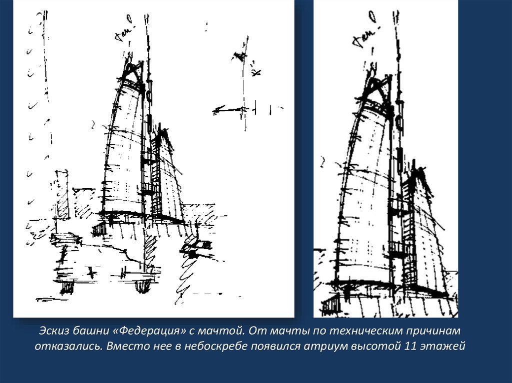 Эскиз башни «Федерация» с мачтой. От мачты по техническим причинамотказались. Вместо нее в небоскребе появился атриум высотой 11 этажей
