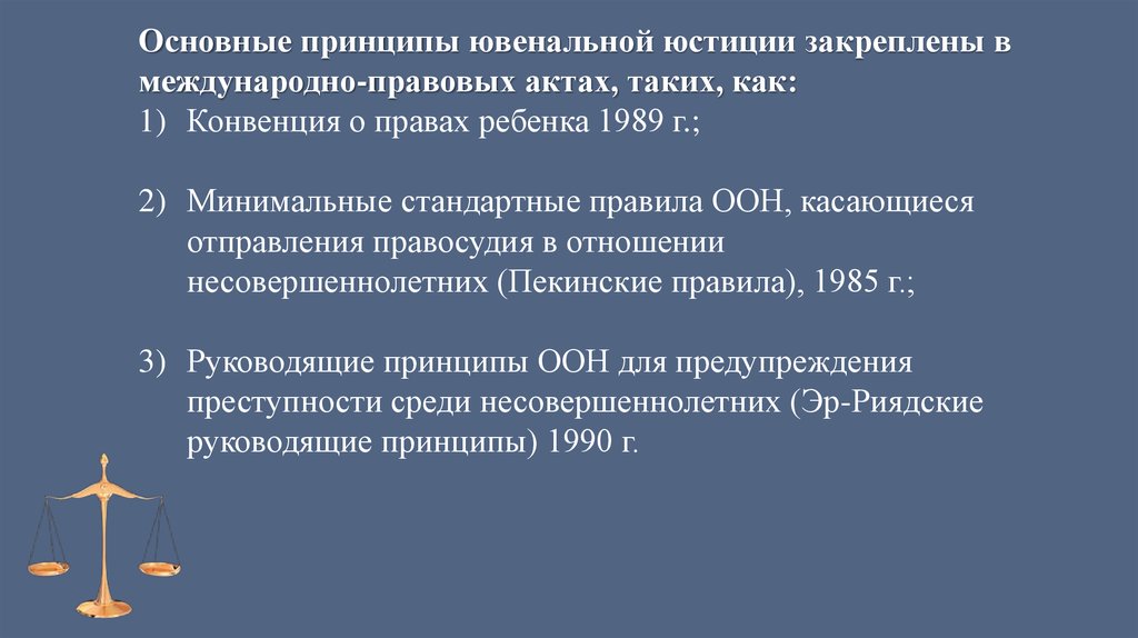 Основные принципы ювенальной юстиции закреплены вмеждународно-правовых актах, таких, как: