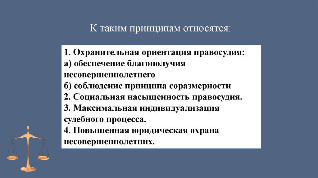 К таким принципам относятся:1. Охранительная ориентация правосудия: