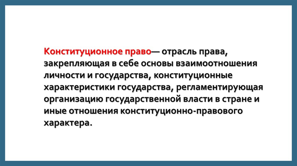 Конституционное право— отрасль права,закрепляющая в себе основы взаимоотношения