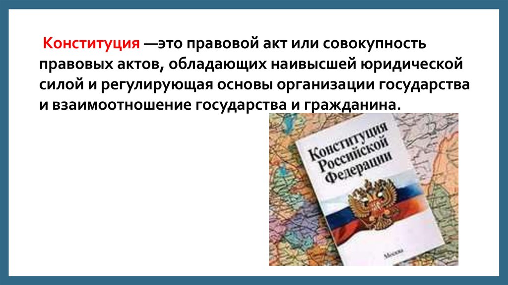 Конституция —это правовой акт или совокупностьправовых актов, обладающих наивысшей юридической