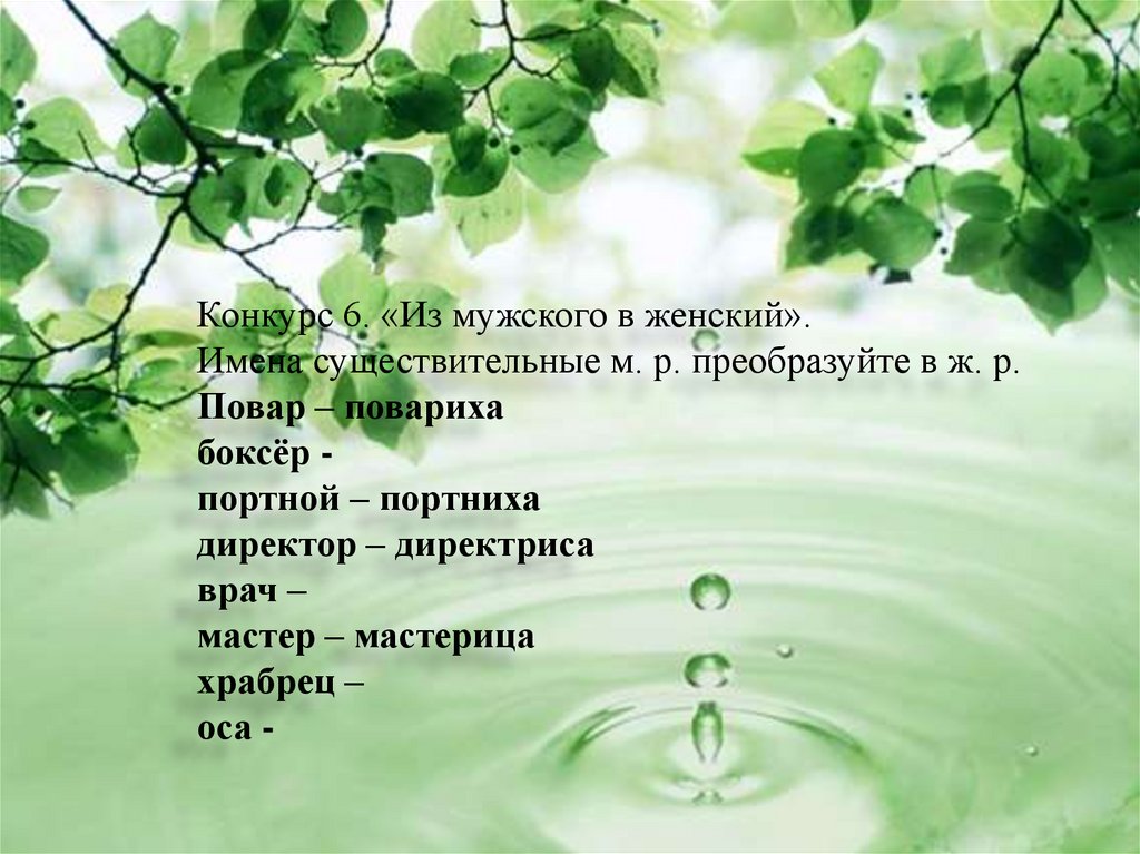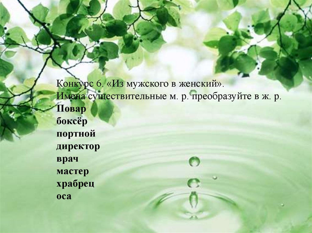 Конкурс 6. «Из мужского в женский».Имена существительные м. р. преобразуйте в ж. р.