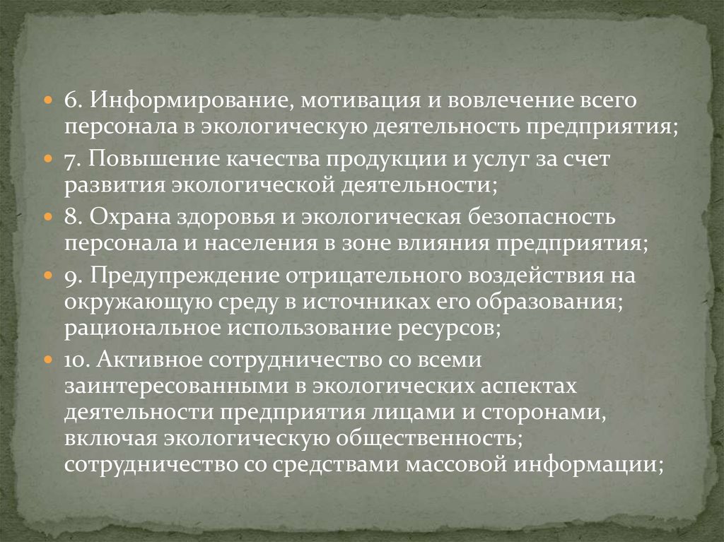 6. Информирование, мотивация и вовлечение всегоперсонала в экологическую деятельность предприятия;
