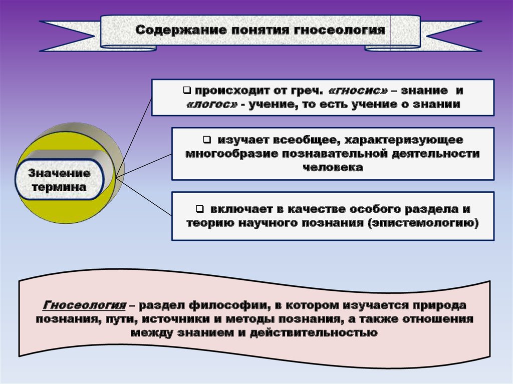 Содержание понятия гносеологияпроисходит от греч. «гносис» – знание и