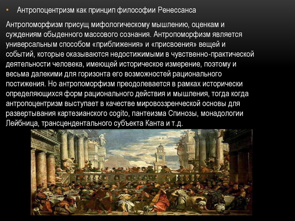 • Антропоцентризм как принцип философии РенессансаАнтропоморфизм присущ мифологическому мышлению, оценкам и