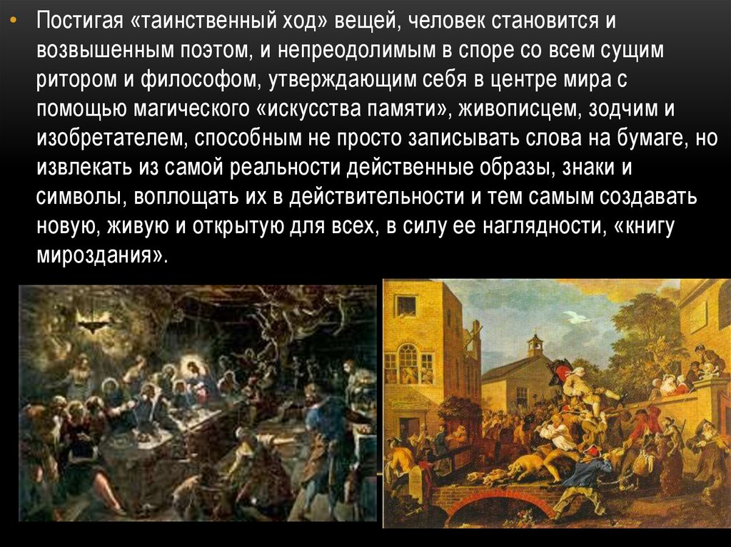 • Ренессансное сознание, отталкиваясь от средневекового теоцентризма в сторонуантропоцентризма, перемещало акцент с «Книги Откровения» на великую и живую
