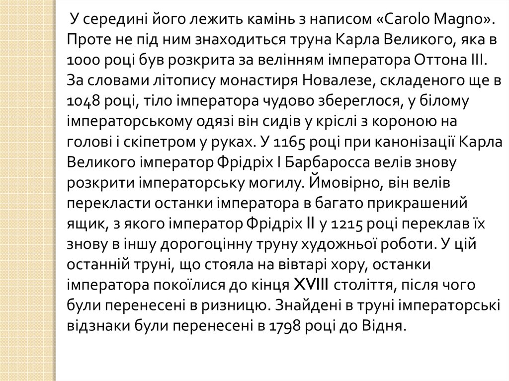 У середині його лежить камінь з написом «Carolo Magno».Проте не під ним знаходиться труна Карла Великого, яка в