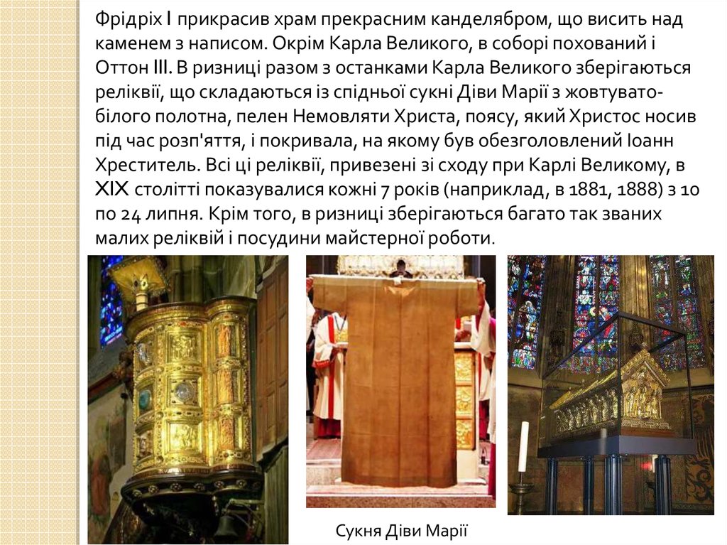 Фрідріх I прикрасив храм прекрасним канделябром, що висить надкаменем з написом. Окрім Карла Великого, в соборі похований і